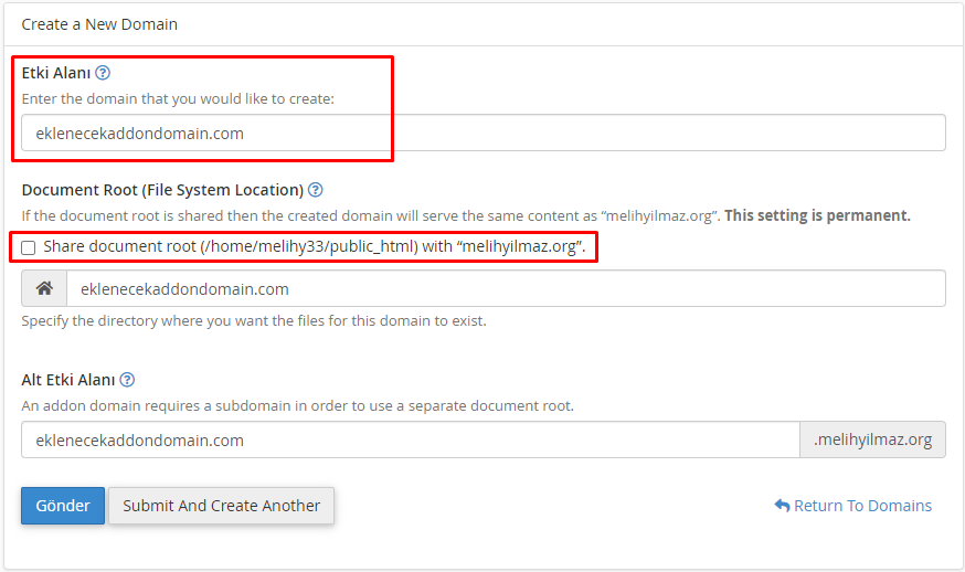 Addon ekleme ekranında öncelikle ekleyeceğiniz alan adını Etki Alanı kısmına giriniz. Ardından document root başlığı altında ki share document root işaretlemesini kaldırınız. Ardından domaini Gönder butonuna tıklayınız.