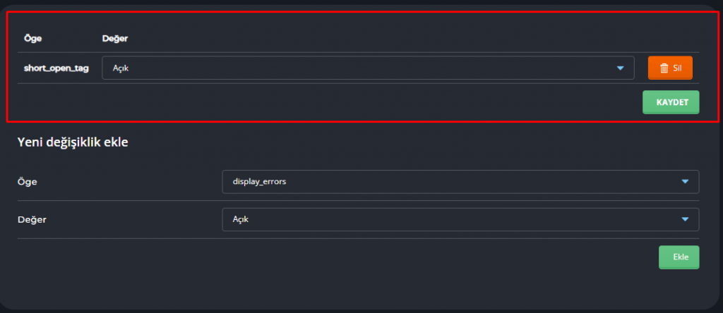 PHP ayarları sayfasında yeni değişikliği eklemeniz gerekecektir. Burada Öğle kısmından Short_open_tag seçeneğini seçerek Değer kısmını Açık halde işaretleyip Ekle butonuna tıklayınız.