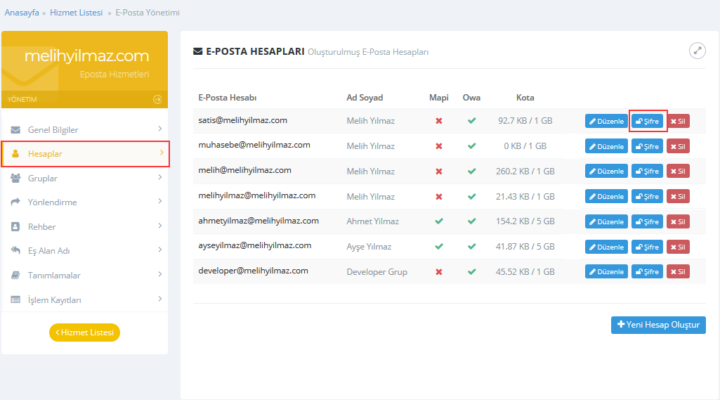 Hesaplar sekmesine tıklayınız. Mevcut hesapların satırında yer alan Şifre butonuna tıklayarak şifre değişikliği formunu görüntüleyebilirsiniz: