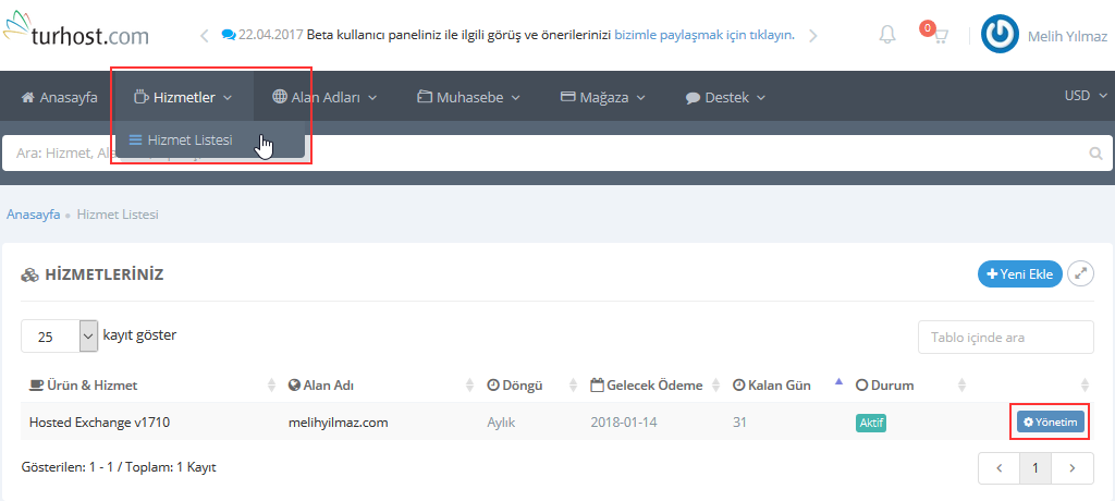 Hizmetler > Hizmet Listesi > Yönetim butonuna tıklayınız: