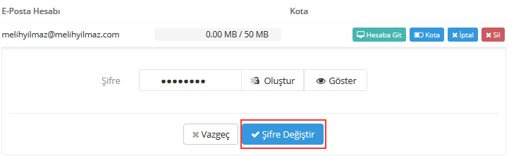 E-posta Yönetimi sekmesine tıklayınız. Mevcut hesapların satırında yer alan Şifre butonuna tıklayarak şifre değişikliği formunu görüntüleyebilirsiniz: