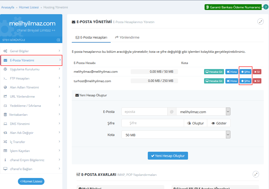 Gelişmiş Panelinizde yer alan E-Posta Yönetimi sayfasında E-Posta hesaplarınızın şifrelerini değiştirebilirsiniz.