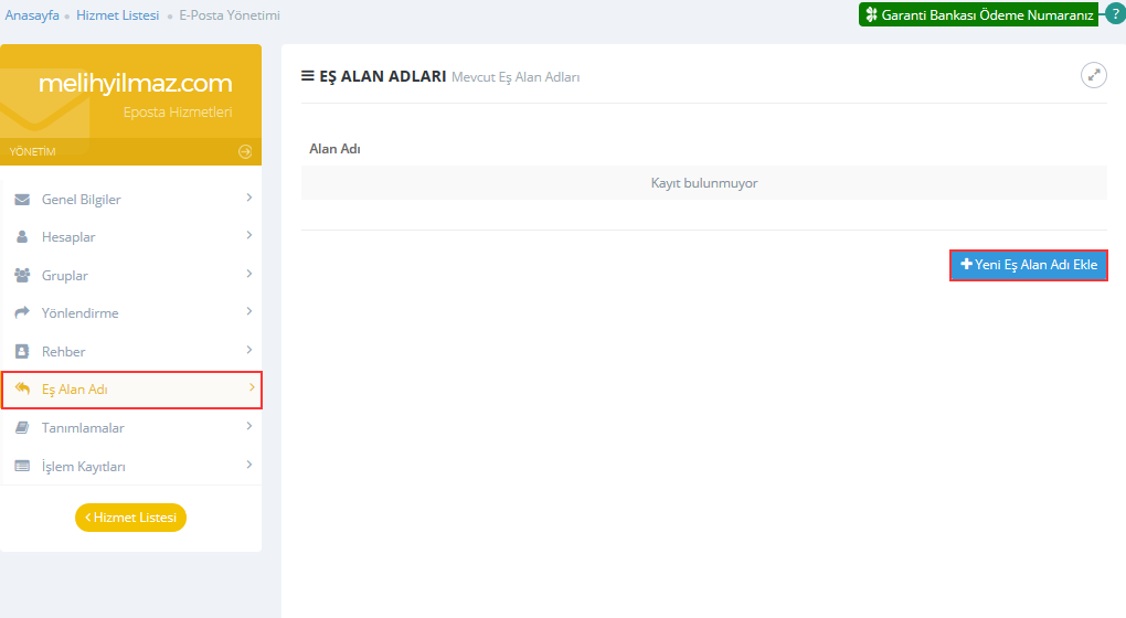 Eş Alan Adları sekmesinde alan adınıza eş alan adları ekleyebilirsiniz. Böylece bu eş alan adlarına gönderilen e-posta iletilerini de ana alan adınıza teslim edilmesini sağlayabilirsiniz: