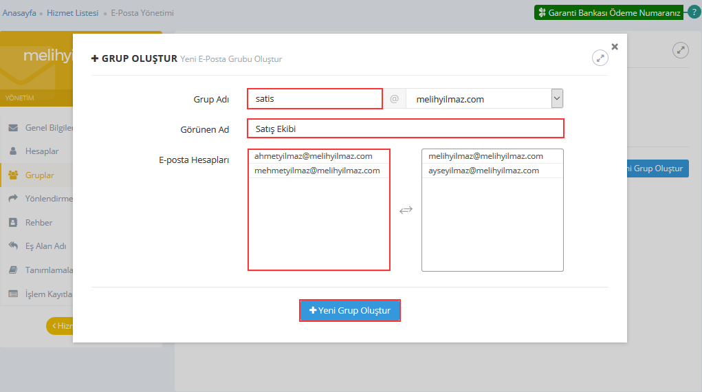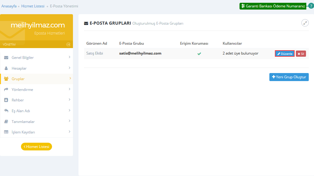 Gruplar sekmesinde E-posta Gruplarınızı/Listelerinizi oluşturabilir ve mevcut gruplarınızı düzenleyebilirsiniz