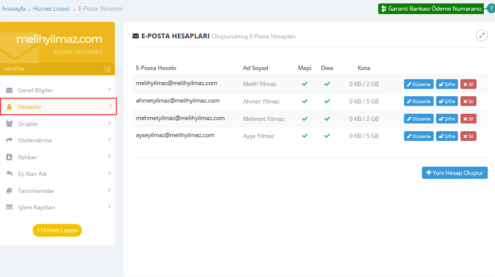 Hesaplar sekmesine gidiniz. Yeni Hesap Oluştur butonuna basarak Kullanıcı bilgilerinizi giriniz ve tekrardan “Yeni E-posta Hesabı Oluştur” butonuna tıklayarak hesabı oluşturunuz. Eklenen hesaplar ilgili sekmede görüntülenecektir: