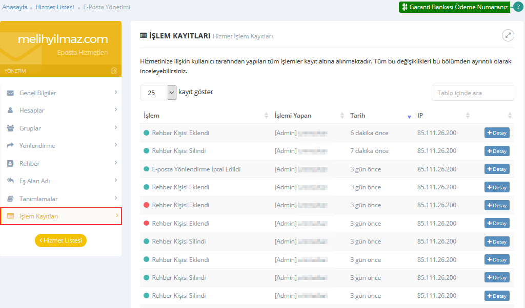 Paneliniz aracılığı ile gerçekleştirmiş olduğunuz işlemlerin geçmişine ait kayıtları İşlem Kayıtları sekmesinde görüntüleyebilirsiniz: