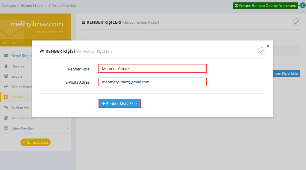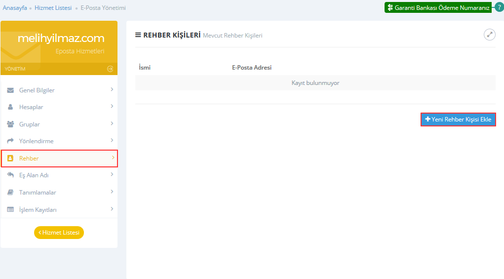 Rehber sekmesinden Yeni Rehber Kişisi Ekle butonuna basarak yeni mail adresi ekleyebilir ve mevcut mail adreslerinizi silebilirsiniz.