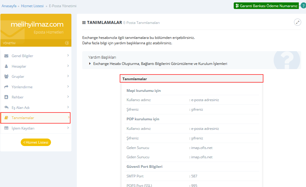 Tanımlamar sekmesinden outlook kurulumu esnasında gerekli bilgileri görebilirsiniz.