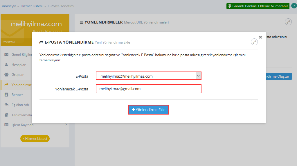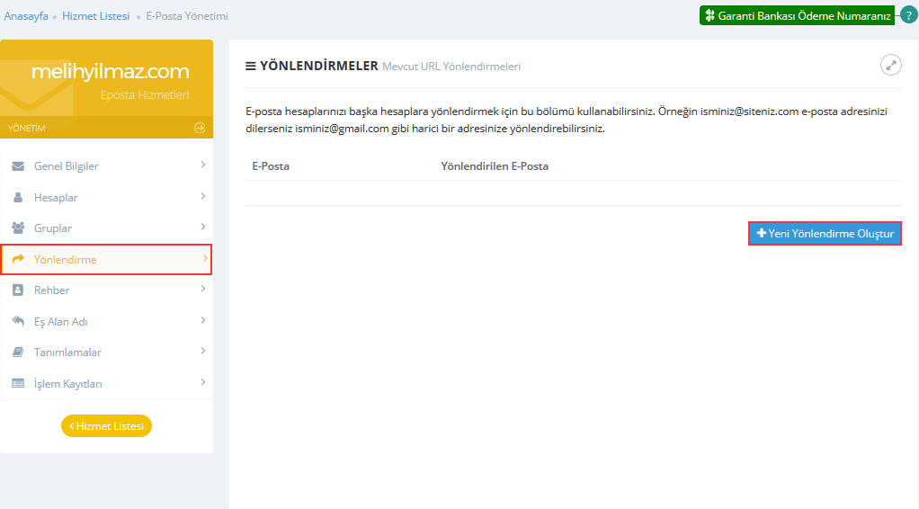 Yönlendirme sekmesinden Yeni Yönlendirme Oluştur butonuna basarak yönlendirmek istediğiniz e-posta adresini secip "Yönlenecek E-Posta" bölümüne bir e-posta adresi girerek yönlendirme işlemini tamamlayabilirsiniz.