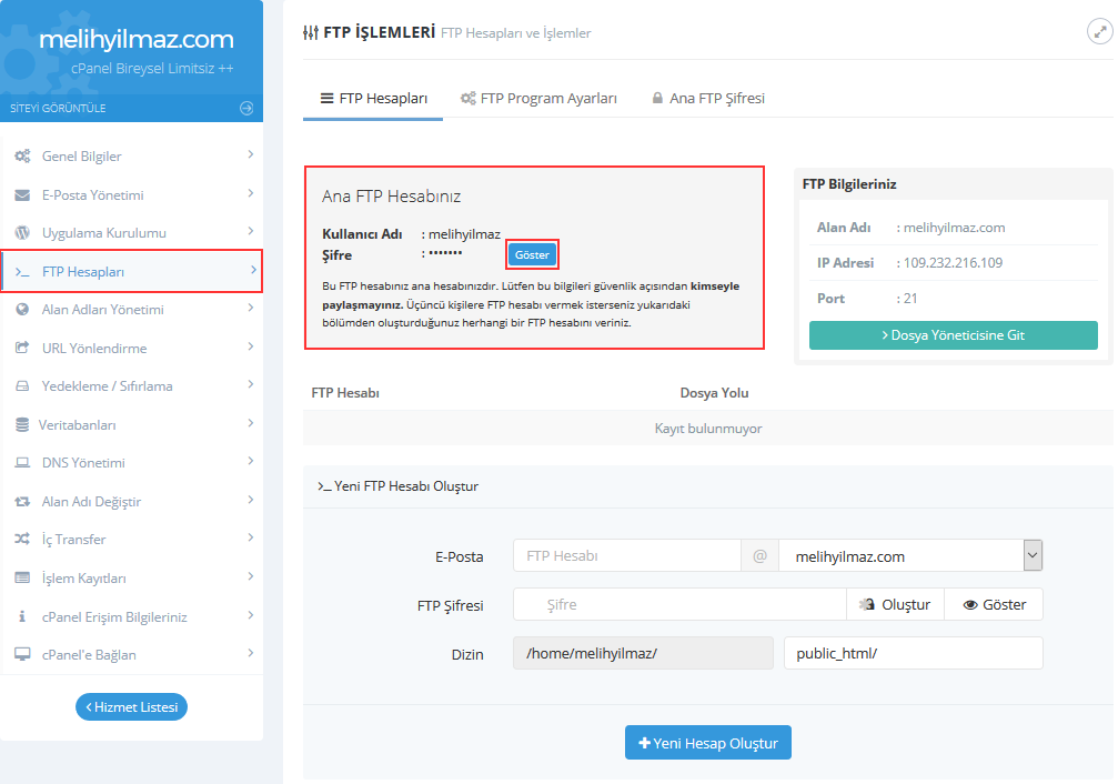 Bu kısımdan ANA FTP hesabınıza ait bilgileri görüntüleyebilir, Yeni FTP hesaplarınızı oluşturabilirsiniz.