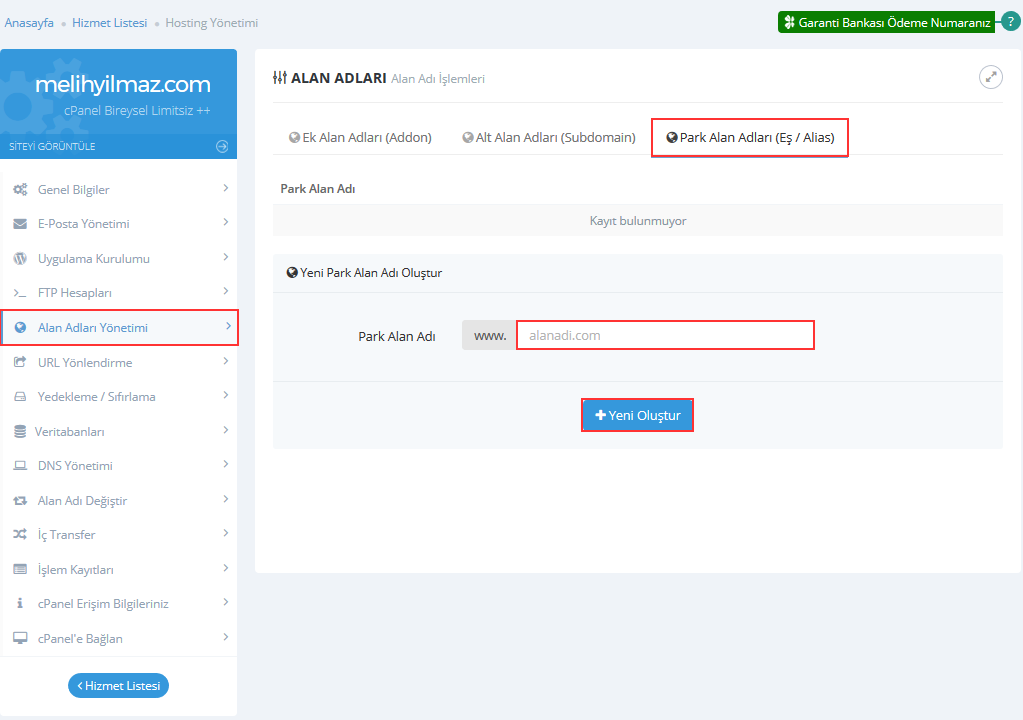 Açılan sayfada Alan Adları Yönetimi sekmesine tıklayınız. Orta kısımdan Park Alan Adları (Eş / Alias) sekmesine geciş yapınız. Park Alan adı kısmına eş domain olarak eklemek istediğiniz alan adınızı yazarak Yeni Oluştur butonuna basınız.
