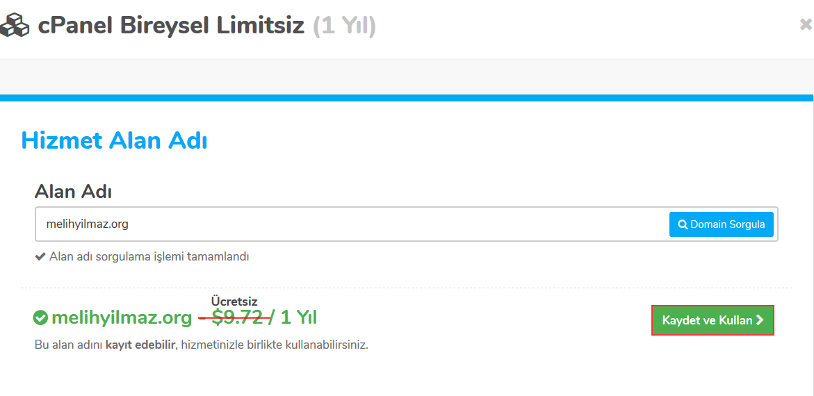 Sorguladığınız domain boşta bir domain ise Kaydet ve Kullan seçeniğini secerek ilerleyiniz.