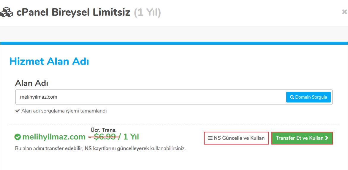 Firmamızda Kayıtlı bir domain ise veya transfer etmeden kullanmak isterseniz