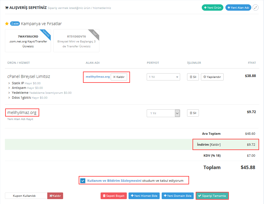 Açılan sayfada siparişinize eklediğiniz hostinge ait domain adını, yeni sipariş oluşturduğunuz domain adını kontrol ediniz. Kampanyalı sipariş oluşturuyorsanız eğer indiriminiz sepetinize otomatik olarak uygulanacaktır. Tüm kontrolleri sağladıktan sonra Kullanım ve Bildirim Sözleşmesini okudum ve kabul ediyorum seçeneğini işaretleyerek Siparişi Tamamla butonuna tıklayınız.