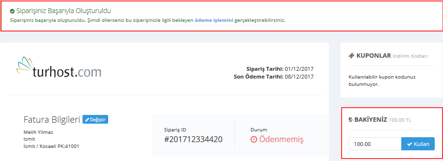 Siparişiniz Başarıyla Oluşturuldu uyarısı ile siparişiniz karşınızda belirecektir. Eğer hesabınızda Bakiyeniz var ise Sağ Sütunda bulunan BAKİYENİZ başlığı altından bakiyenizi görüntüleyebilir, istediğiniz tutarı ilgili bölüme yazarak siparişinizde kullanabilirsiniz.