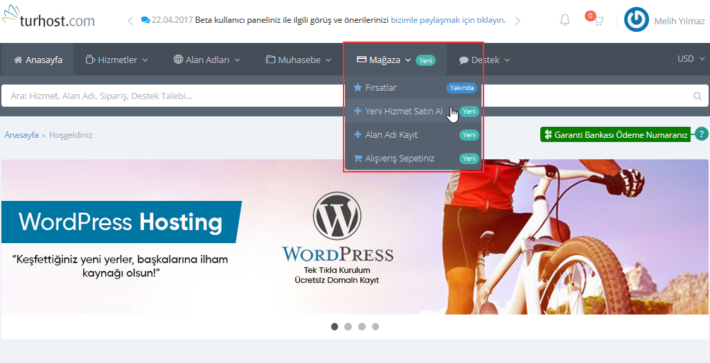 Panelinizde yer alan Yeni Hizmet Satın Al bağlantısını kullanarak yeni alan adları, hosting paketleri, dedicated/bulut sunucular, SSL sertifikaları, cPanel, Plesk lisanları vb. birçok hizmeti kolayca satın alabilir, siparişlerinizi oluşturabilirsiniz.