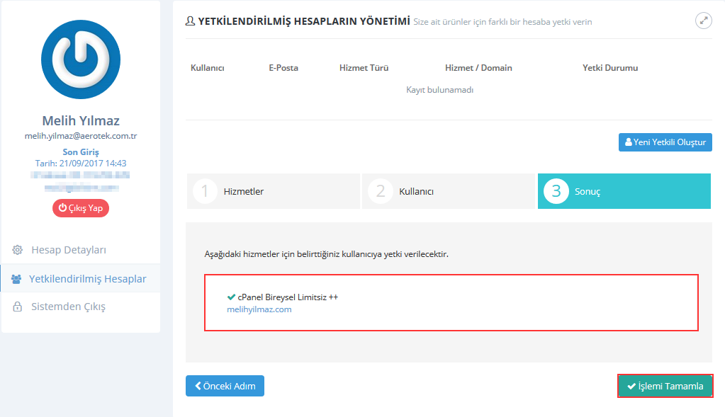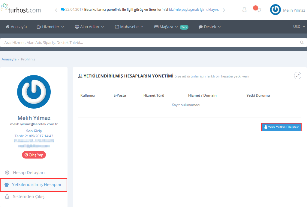 Gelişmiş Panelinizde yer alan Yetkilendirilmiş Hesaplar sayfanızda hesabınızda bulunan ürünler için hesap yetkilendirebilirsiniz. Yetkilendirdiğiniz hesapların izinlerini ve erişebilecekleri hizmetleri belirleyebilirsiniz.