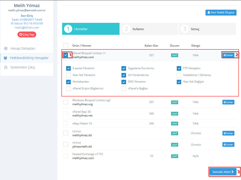 2. İzinler butonuna tıklayarak yetkilendireceğiniz kişinin erişim sağlamasını istediğiniz kısımları işaretleyiniz.