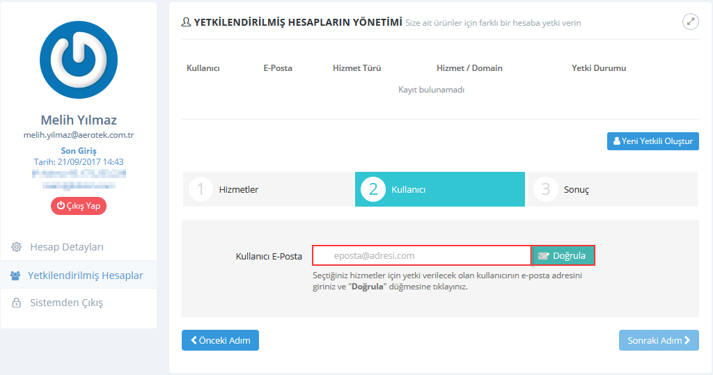 Yetki vermek istediğiniz Kullanıcı E posta Adresini yazınız ve Doğrula butonuna tıklayınız: