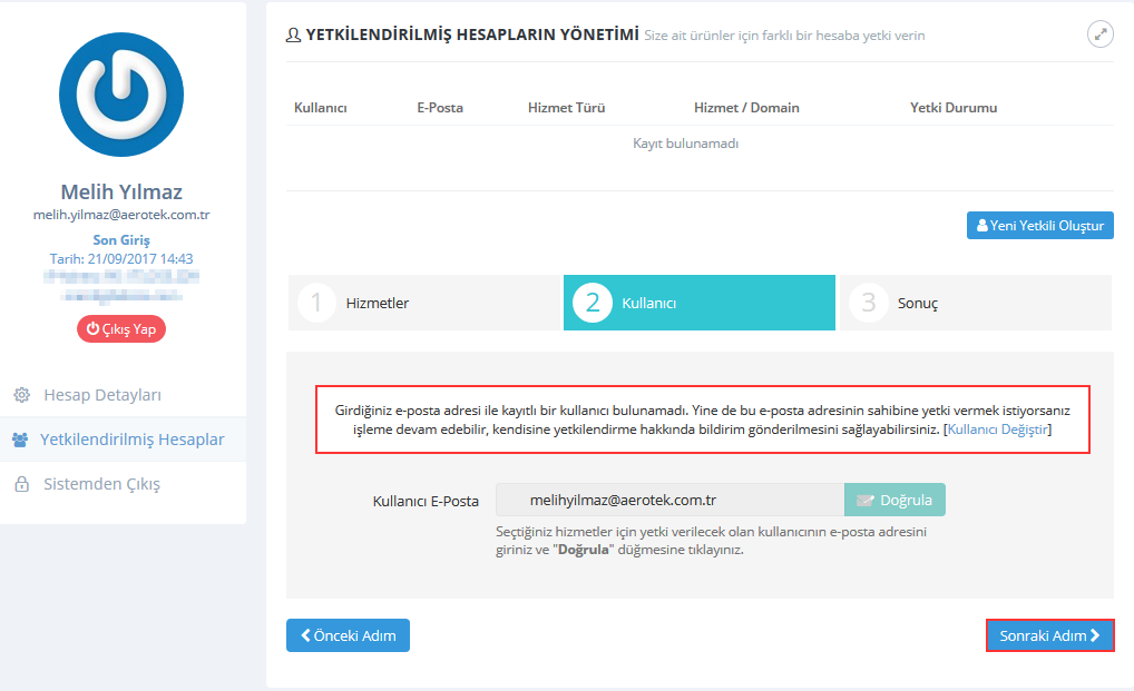 Yazdığınız Kullanıcı E-Posta adresi sistemimizde kayıtlı ise müşterimizin kayıtlı hesabı çıkacaktır, kayıtlı değil ise aşağıdaki sekilde uyarı ile karşılaşıyor olacaksınız. Bu ekranda Sonraki Adım butonuna tıklayınız.