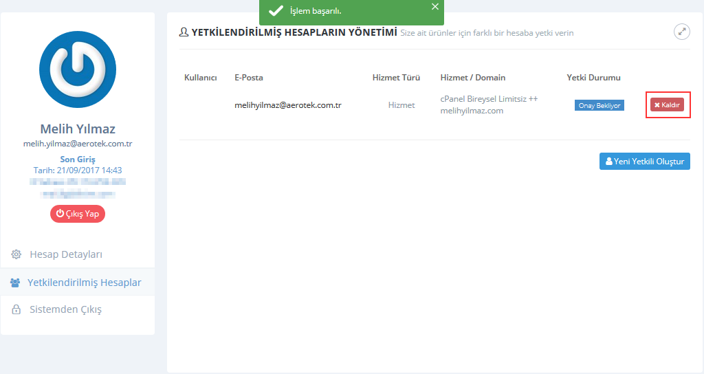 İşlem Başarılı bir şekilde başlatılacaktır. Yetki verdiğiniz kişi kendi hesabına girip verilen yetkiyi onaylamalı veya reddetmelidir. Siz yaptığınız işlemi iptal etmek isterseniz Kaldır butonuna tıklayarak verdiğiniz yetkiyi iptal edebilirsiniz.