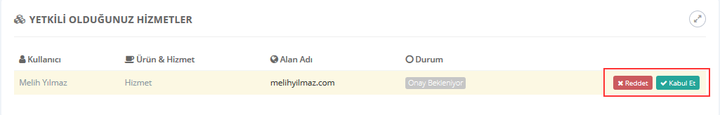 Yetki verilen hesapta aşagıdaki şekilde Reddet ve Kabul Et butonları aktiftir. Buradan seçim yapılarak ilerleyebilirsiniz.