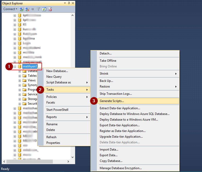 Veritabanınızın adına sağ tıklayınız, Tasks > Generate Scripts seçeneğine tıklayınız: