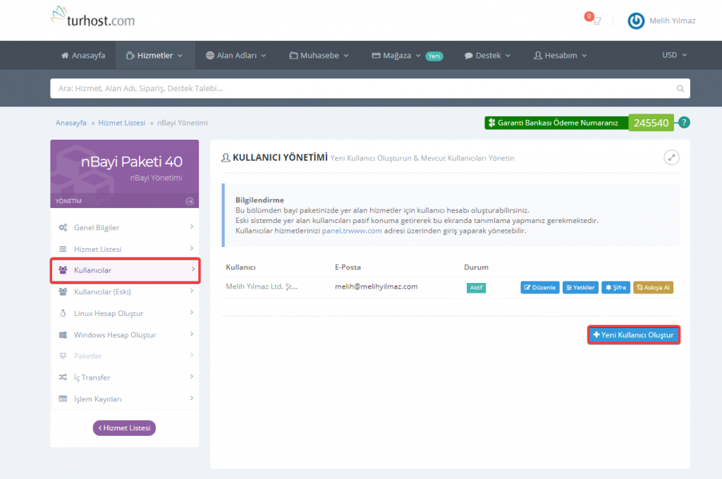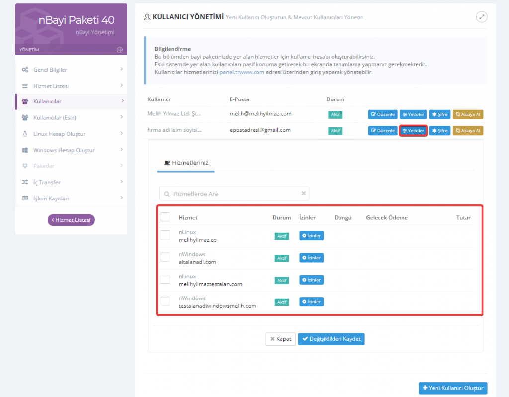Eklediğiniz kullanıcın hangi hizmetlere sahip erişebileceğini Yetkiler butonuna tıklayarak düzenleyebilirsiniz. Ek olarak şifre değişikliği veya kullanıcı değişikliklerini
