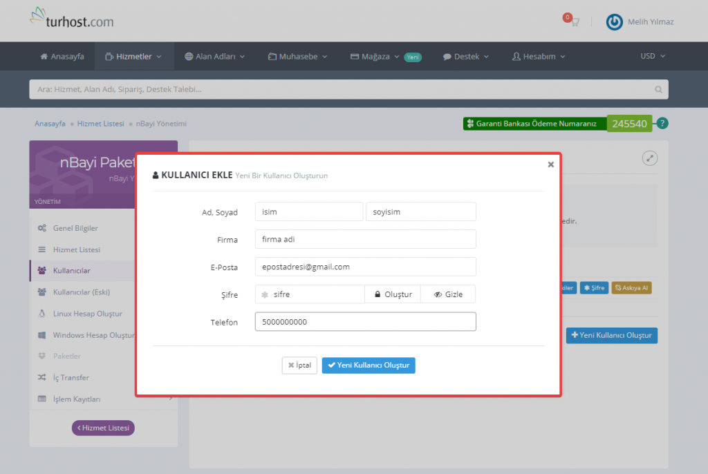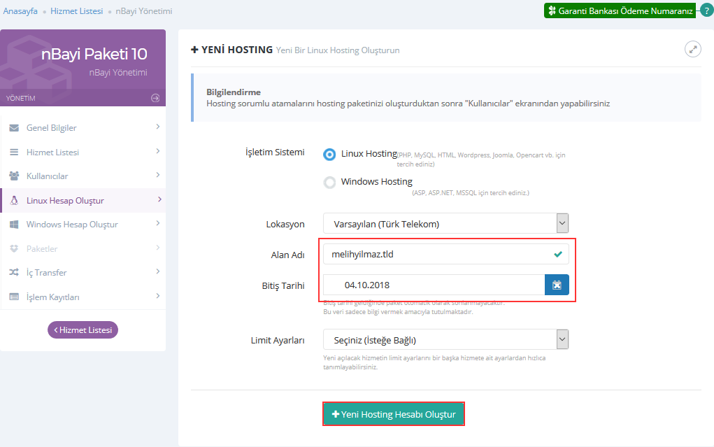 Yeni Hosting Hesabı Oluştur butonuna tıkladığınızda paketiniz oluşturulacaktır: