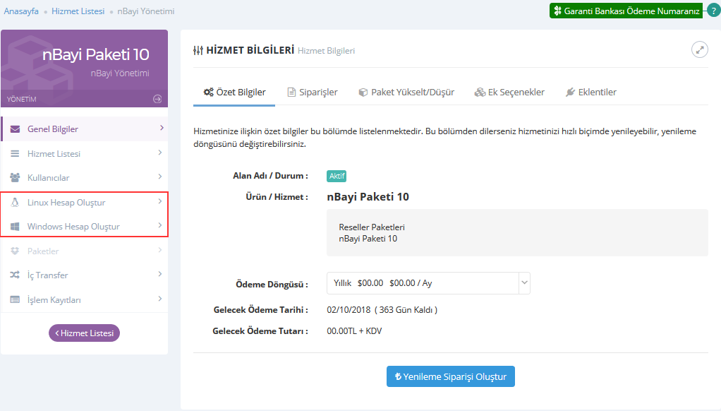 Oluşturulan paketleri Hizmet Listesi sekmesinde görüntüleyebilirsiniz. Paketleri askıya almak, bitiş tarihlerini değiştirmek veya paketleri tamamen silmek için Yönetim butonuna tıklayınız: