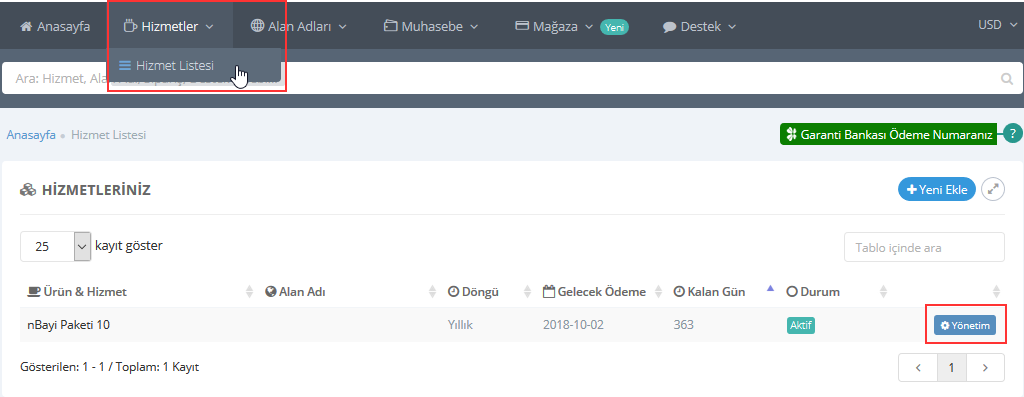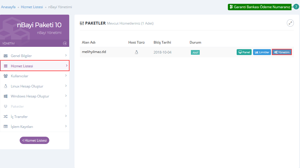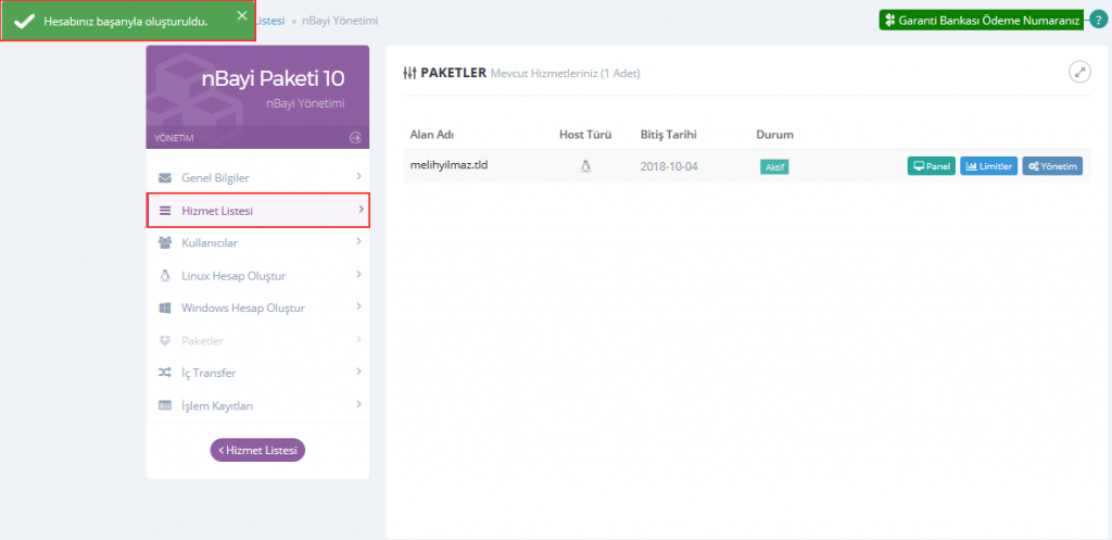 Oluşturulan hosting paketleriniz Hizmet Listesi sekmesinde görüntülenmektedir: