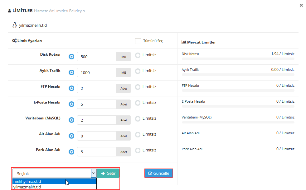 Paket limitlerinizi belirledikten sonra Güncelle butonuna tıklayarak limitlerinizi kaydedebilirsiniz. Mevcut bir paketinizdeki limitleri kullanmak isterseniz sol alt kısımda bulunan Getir butonunu kullanabilirsiniz.