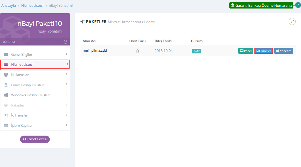 Hizmet Listesi sayfasında yer alan paket satırındaki Limitler butonuna tıklayınız: