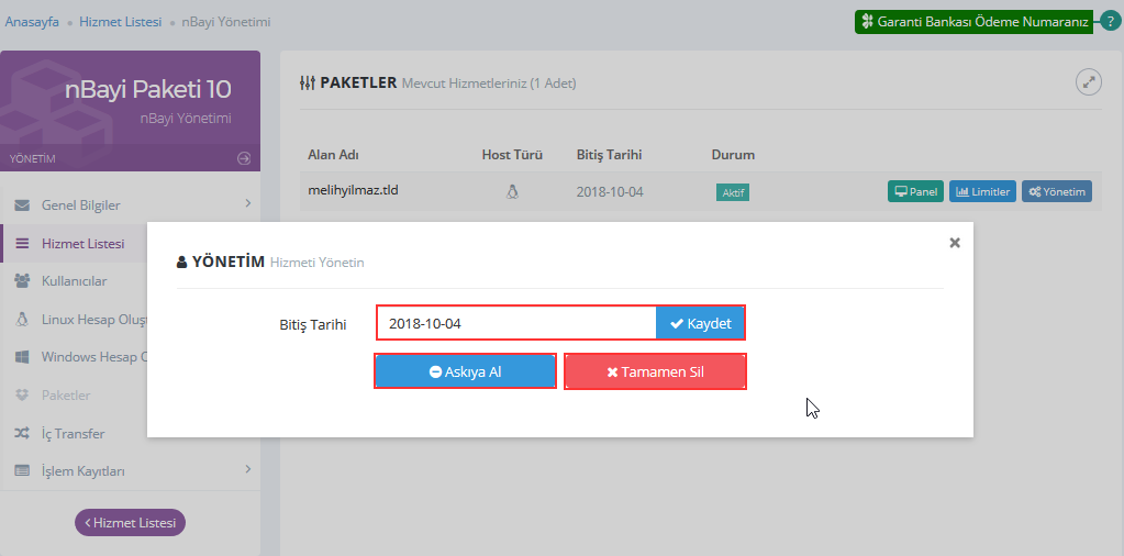Bu kısımdan paketinize bitiş tarihi belirleyebilir, paketinizi askıya alabilir veya paketinizi tamamen silebilirsiniz.