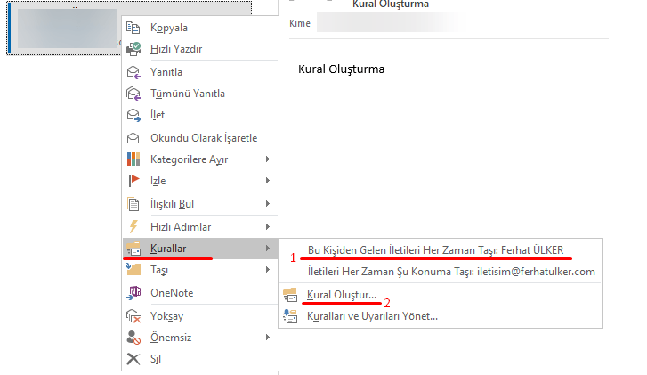Herhangi bir mailin üstüne sağ tıklayarak Kurallar > Kuralları ve Uyarıları Yönet seçeneğinden kurallarınızı kontrol edebilirsiniz. Tümünü devre dışı bırakıp testler sağlamanız tespit açısından daha sağlıklı olacaktır.